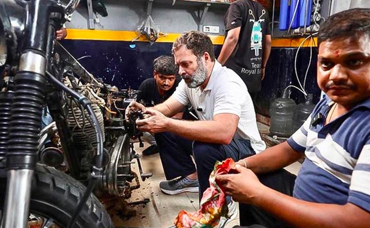 कांग्रेस ने भी पार्टी के पूर्व अध्यक्ष की तस्वीरें फेसबुक पर साझा की हैं, जिनमें वह मोटरसाइकिल ठीक करना सीखते हुए और मैकेनिक से बातचीत करते हुए नजर आ रहे हैं.