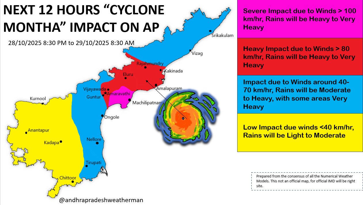 चक्रवात ‘मोंथा’ का असर: अगले 12 घंटे आंध्र प्रदेश में तेज हवाएं और भारी बारिश की चेतावनी
