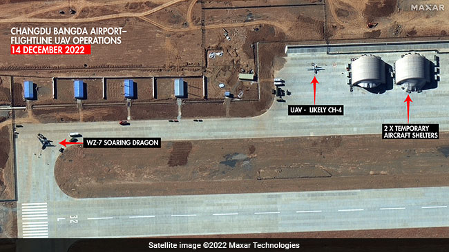 अरुणाचल प्रदेश की सीमा से 150 किलोमीटर पूर्वोत्तर में स्थित चीन के बांगदा एयरबेस से मिली तस्वीर में अत्याधुनिक डब्ल्यूज़ेड-7 'सोरिंग ड्रेगन' ड्रोन दिखाई देता है. वर्ष 2021 में पहली बार आधिकारिक रूप से जारी किए गए 'सोरिंग ड्रेगन', जो बिना रुके 10 घंटे तक उड़ सकता है, को जासूसी, निगरानी और सर्वेक्षण के कामों के लिए बनाया गया है, तथा यह डेटा को ट्रांसमिट भी कर सकता है, ताकि क्रूज़ मिसाइलें ज़मीनी लक्ष्यों पर वार करने में सक्षम हो सकें.