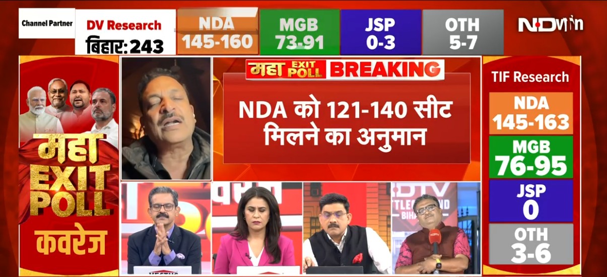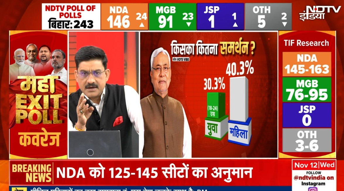 बिहार चुनाव को लेकर TIF Research के एग्जिट पोल के अनुसार भी बिहार में एनडीए को 145-163 सीटें मिलने का अनुमान है. वहीं, महागठबंधन को 76 से 95 सीटें मिल सकती हैं.
