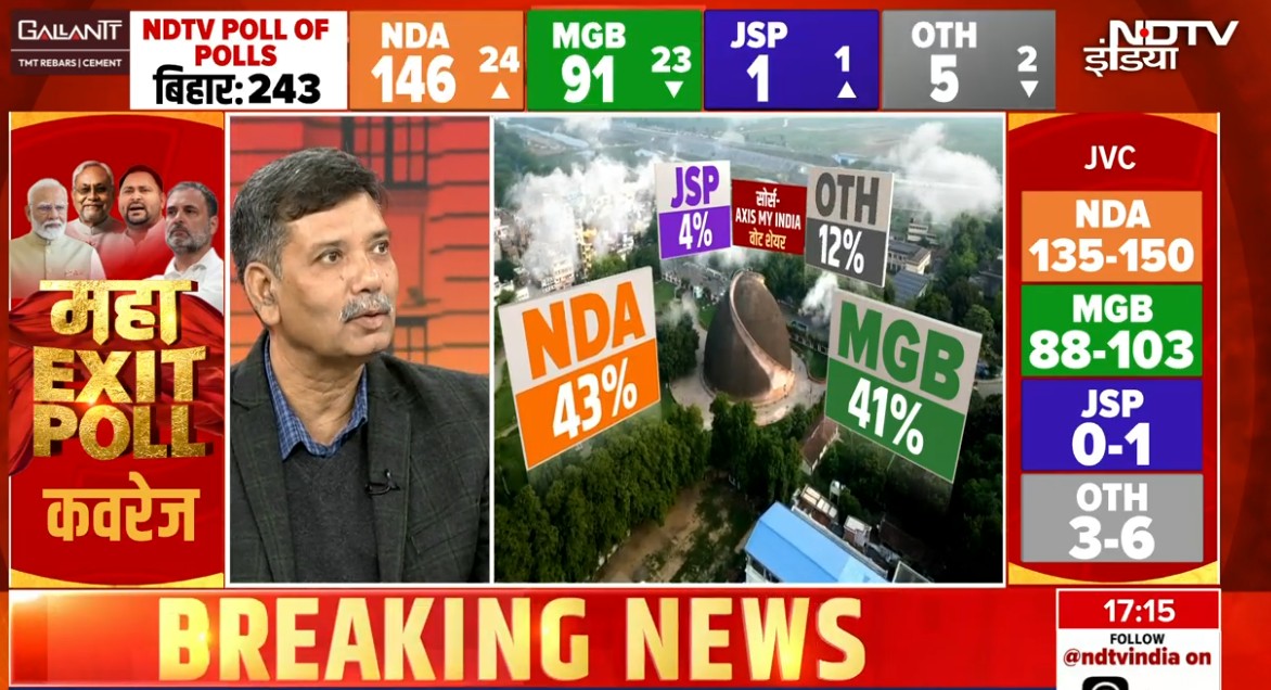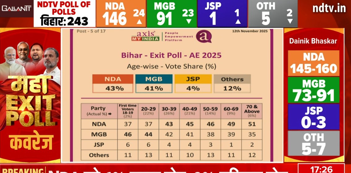 एक्सिस एग्जिट पोल के अनुसार एनडीए को कुल 43 फीसदी वोट मिले हैं जबकि महागठबंधन को 41 फीसदी वोट मिला है. वहीं जनसुराज पार्टी को 4 फीसदी वोट मिला है. जबकि अन्य के खाते में 12 फीसदी वोट जाने की बात कही गई है.