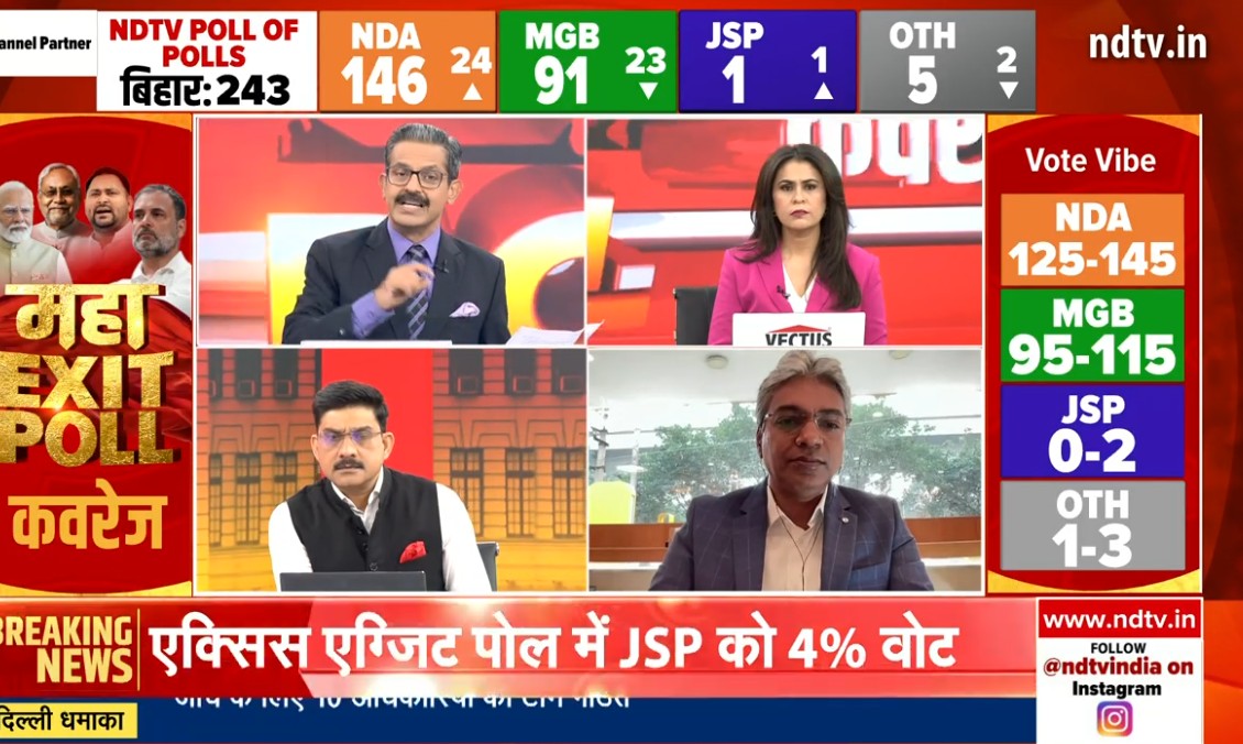 बिहार विधानसभा चुनाव को लेकर मंगलवार को आए एग्जिट पोल में सभी सर्वे एजेंसियों ने NDA को स्पष्ट बहुमत के साथ सत्ता में आने बात कही थी. अलग-अलग सर्वे एजेंसियों ने एनडीए को 130 से 163 सीटें मिलने की बात कही गई है. दूसरी ओर महागठबंधन को 70 से 108 सीटें मिलने की संभावना जताई गई है. NDTV पोल ऑफ पोल्स के अनुसार एनडीए को 147 सीटें मिल सकती है. जबकि महागठबंधन को 90 सीटें मिल सकती है. जन सुराज को एक तो अन्य को 0-5 सीटें मिल सकती है.