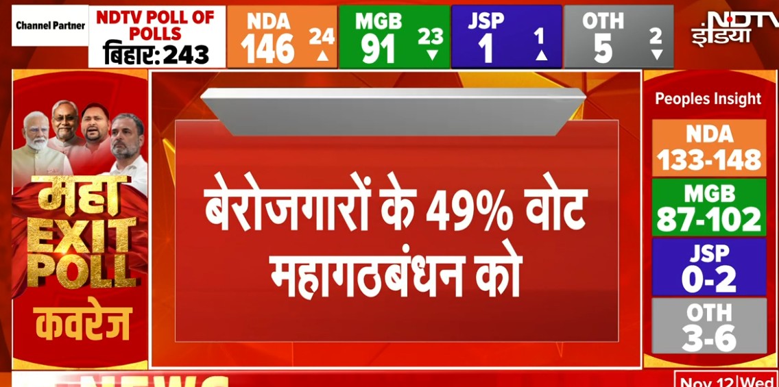 एक्सिस के एग्जिट पोल के अनुसार बिहार में बेरोजगार युवाओं की पहली पसंद महागठबंधन है. यही वजह है कि 49 फीसदी बेरोजगार युवाओं ने महागठबंधन को वोट किया है. वहीं एनडीए के खाते में 34 फीसदी वोट गए हैं.