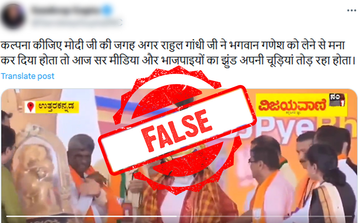सच्चाई : यह वीडियो 3 मई, 2023 को कर्नाटक विधानसभा चुनाव के लिए प्रधानमंत्री नरेंद्र मोदी के प्रचार कार्यक्रम के दौरान उत्तर कन्नड़ जिले के अंकोला में आयोजित एक सार्वजनिक बैठक का है. बैठक के मूल वीडियो को टाइमस्टैम्प 02:05 और 02:16 के बीच एडिट किया गया, और झूठे दावे के साथ शेयर किया गया. वीडियो के पूरे संस्करण में स्पष्ट रूप से देखा जा सकता है कि PM ने उन्हें भेंट की गई भगवान गणेश की मूर्ति को स्वीकार किया, और मूर्ति के साथ तस्वीरें भी क्लिक करवाईं - इसलिए सोशल मीडिया में फैलाए जा रहे पोस्ट में किया गया दावा FALSE गलत है.