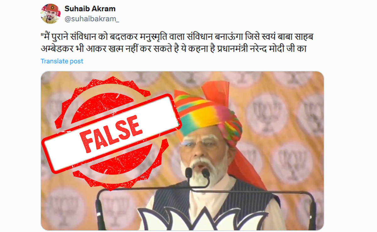 हाल ही में सोशल मीडिया पर एक वीडियो पोस्ट किया गया, जिसमें दावा किया गया कि प्रधानमंत्री नरेंद्र मोदी ने देश के संविधान को बदलकर मनुस्मृति लागू करने की बात कही है. माइक्रो-ब्लॉगिंग वेबसाइट X (अतीत में ट्विटर) पर किए गए इस पोस्ट का आर्काइव लिंक यहां है.