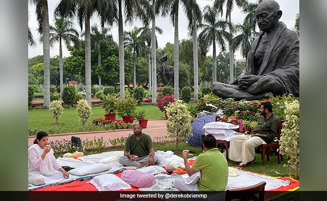 टीएमसी के राज्यसभा सांसद ड्वेर्क ओ ब्रायन ने ट्वीट किया, "विपक्षी सांसदों द्वारा 50 घंटे का नॉन-स्टॉप धरना. 21 घंटे पूरे हो गए हैं, 29 घंटे बाकी हैं. 24 सांसदों का निलंबन रद्द करें. चर्चा करें.