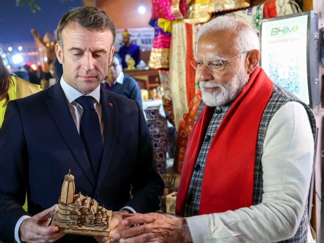 मैक्रों अपने भारत दौरे के तहत गुरुवार दोपहर जयपुर पहुंचे थे जहां राज्यपाल कलराज मिश्र, विदेश मंत्री एस जयशंकर और मुख्यमंत्री भजनलाल शर्मा ने मैक्रों का स्वागत किया. उन्होंने प्रधानमंत्री मोदी के साथ जयपुर के परकोटे में स्थित जंतर मंतर से सांगानेरी गेट तक रोड शो भी किया. प्रधानमंत्री मोदी ने मैक्रों को अयोध्या में नवनिर्मित राम मंदिर की प्रतिकृति उपहार में दी. दोनों नेताओं ने एक साथ मसाला चाय की चुस्की भी ली.