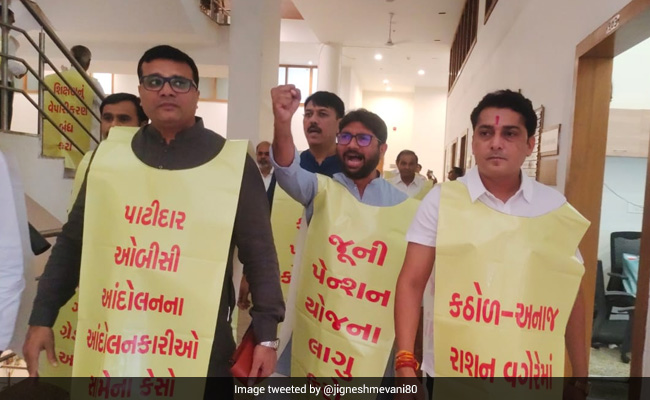 अध्यक्ष के आसन के पास करीब दस विधायक बैठे थे तभी पार्टी के अन्य विधायकों ने तख्तियां प्रदर्शित करते हुए “ओबीसी को 27 प्रतिशत आरक्षण दो” के नारे लगाए. इसके अलावा उन्होंने “जाति आधारित जनगणना” की मांग करते हुए भी नारेबाजी की. कांग्रेस द्वारा अचानक विरोध प्रदर्शन करने से परेशान, विधायी और संसदीय कार्यमंत्री राजेंद्र त्रिवेदी के नेतृत्व में सत्तारूढ़ भारतीय जनता पार्टी ने अध्यक्ष से उक्त विधायकों के विरुद्ध कार्रवाई करने को कहा. इसके बाद अध्यक्ष ने नौ से दस विधायकों के निलंबन का आदेश दिया जिसमें ठाकोर और मेवानी शामिल थे. कुछ विधायकों ने सदन से बाहर जाने से इनकार किया जिसके बाद मार्शलों की सहायता से उन्हें बाहर निकाला गया.
