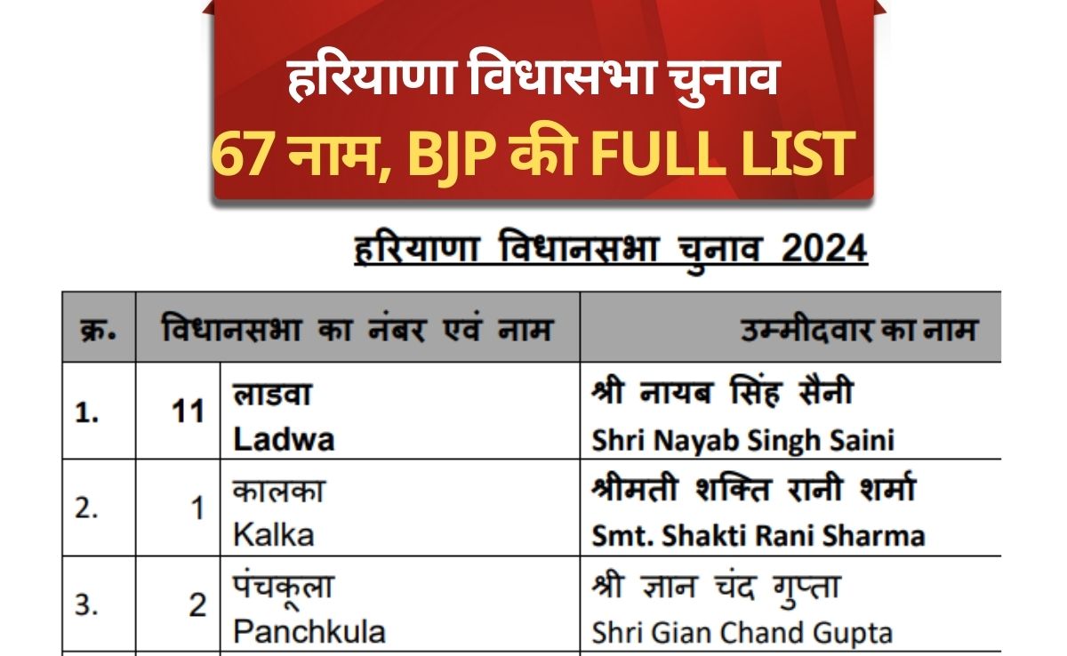 हरियाणा में बीजेपी ने आखिरकार टिकटों पर सस्पेंस खत्म कर दिया है. कई दिनों के मंथन के बाद बुधवार शाम को बीजेपी ने 67 उम्मीदवारों की लिस्ट जारी कर दी है. इस लिस्ट की बड़ी बात यह है कि बीजेपी ने 40 उम्मीदवार बदले हैं. जैसे कि कयास लगाए जा रहे थे नायब सिंह सैनी की सीट बदलकर उन्हें लाडवा से मैदान में उतारा गया है. बीजेपी ने राज्यसभा सांसद किरण चौधरी की बेटी श्रुति चौधरी को तोशाम से टिकट दिया है. बागी तेवर दिखाने वाले राव नरबीर सिंह को बादशाहपुर से मैदान में उतारा गया है. देखिए किस विधानसभा सीट पर किसे दिया गया है टिकट