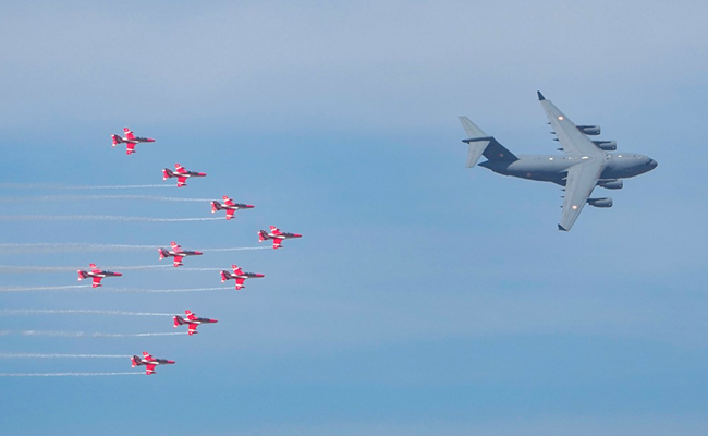 एयरो इंडिया 2023 में 'सूर्यकिरण' एयरबैटिक टीम से घिरे भारतीय वायुसेना के सी-17 ग्लोबमास्टर ने खूबसूरत जलवे दिखाए...