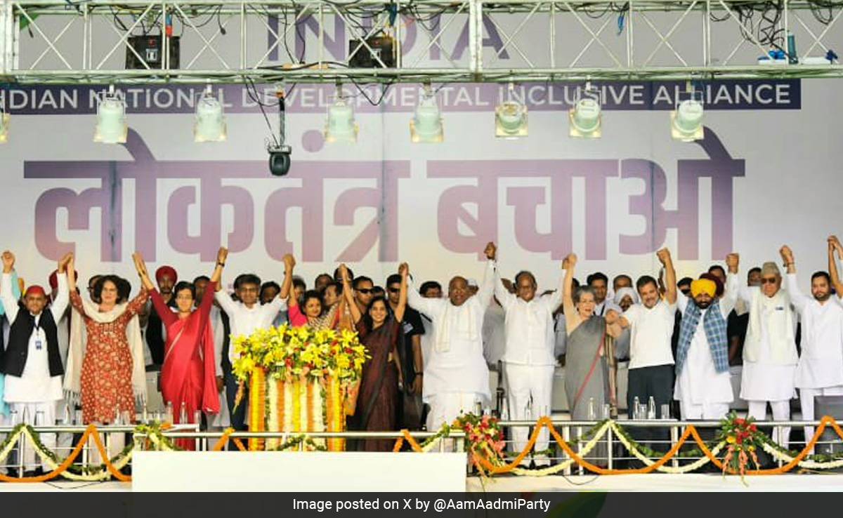 लोकसभा चुनाव से पहले दिल्ली के ऐतिहासिक रामलीला मैदान में विपक्षी गठबंधन ‘इंडियन नेशनल डेवलपमेंटल इन्क्लूसिव अलायंस' (INDIA) की तरफ से एक बड़ी रैली का आयोजन किया गया. इस रैली में सोनिया गांधी (Sonia Gandhi), मल्लिकार्जुन खरगे, राहुल गांधी, शरद पवार, अखिलेश यादव, तेजस्वी यादव, फारुक अब्दुल्ला, सीताराम येचुरी सहित कई नेताओं ने हिस्सा लिया. विपक्षी दलों की तरफ से रामलीला मैदान से पांच सूत्री मांगें रखीं गयी है. जिनमें दिल्ली के मुख्यमंत्री अरविंद केजरीवाल और झारखंड के पूर्व मुख्यमंत्री हेमंत सोरेन की तत्काल की रिहाई की मांग भी शामिल है. कांग्रेस महासचिव प्रियंका गांधी वाद्रा ने विपक्ष की ‘लोकतंत्र बचाओ महारैली' में मंच से ‘इंडिया' गठबंधन की तरफ से ये मांगें रखीं.