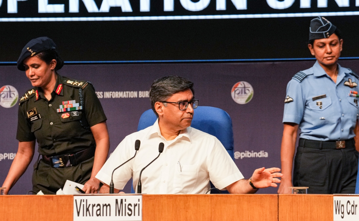 नई दिल्ली स्थित नेशनल मीडिया सेंटर में ऑपरेशन सिंदूर की जानकारी देते विदेश सचिव विक्रम मिसरी और सेना की कर्नल सोफिया कुरैशी और वायुसेना की व्योमिका सिंह.