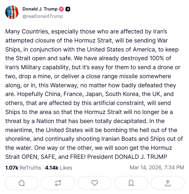US के राष्ट्रपति डोनाल्ड ट्रंप ने कहा, 'कई देश, खासकर वे जो ईरान द्वारा होर्मुज जलडमरूमध्य को बंद करने की कोशिश से प्रभावित हैं, अमेरिका के साथ मिलकर इस जलडमरूमध्य को खुला और सुरक्षित रखने के लिए युद्धपोत भेजेंगे. हमने ईरान की 100% सैन्य क्षमता को पहले ही खत्म कर दिया है, लेकिन ईरान ड्रोन छोटा मोटा और मिसाइल अटैक कर सकता है, भले ही वे कितनी भी बुरी तरह हार गए हों. उम्मीद है कि चीन, फ्रांस, जापान, दक्षिण कोरिया, UK और अन्य देश इस इलाके में अपने जहाज भेजेंगे ताकि होर्मुज जलडमरूमध्य अब उस देश से कोई खतरा न रहे जिसकी सैन्य शक्ति पूरी तरह से खत्म हो चुकी है. अमेरिका तटरेखा पर जोरदार बमबारी करेगा और लगातार ईरानी नावों और जहाजों को पानी में ही नष्ट करता रहेगा. किसी भी तरह से हम जल्द ही होर्मुज जलडमरूमध्य को खोल देंगे.