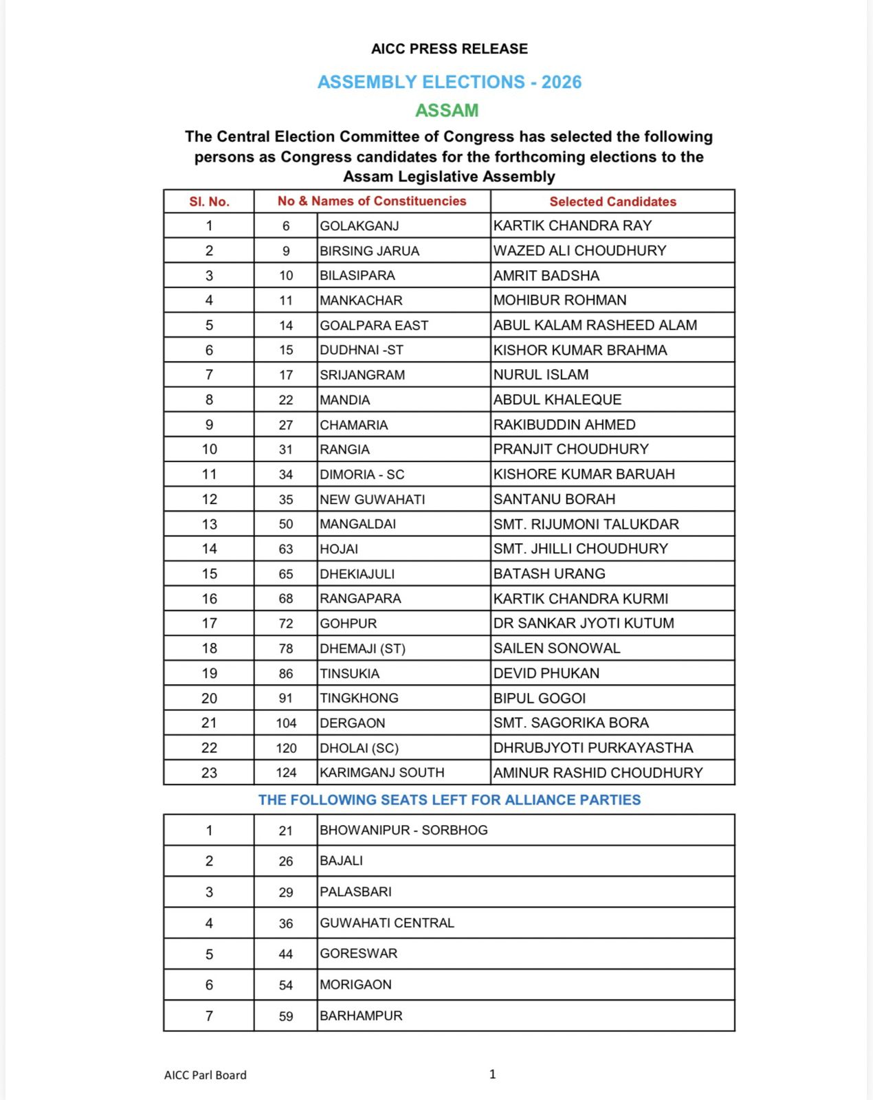 असम चुनाव के लिए कांग्रेस ने जारी की उम्मीदवारों की दूसरी लिस्ट