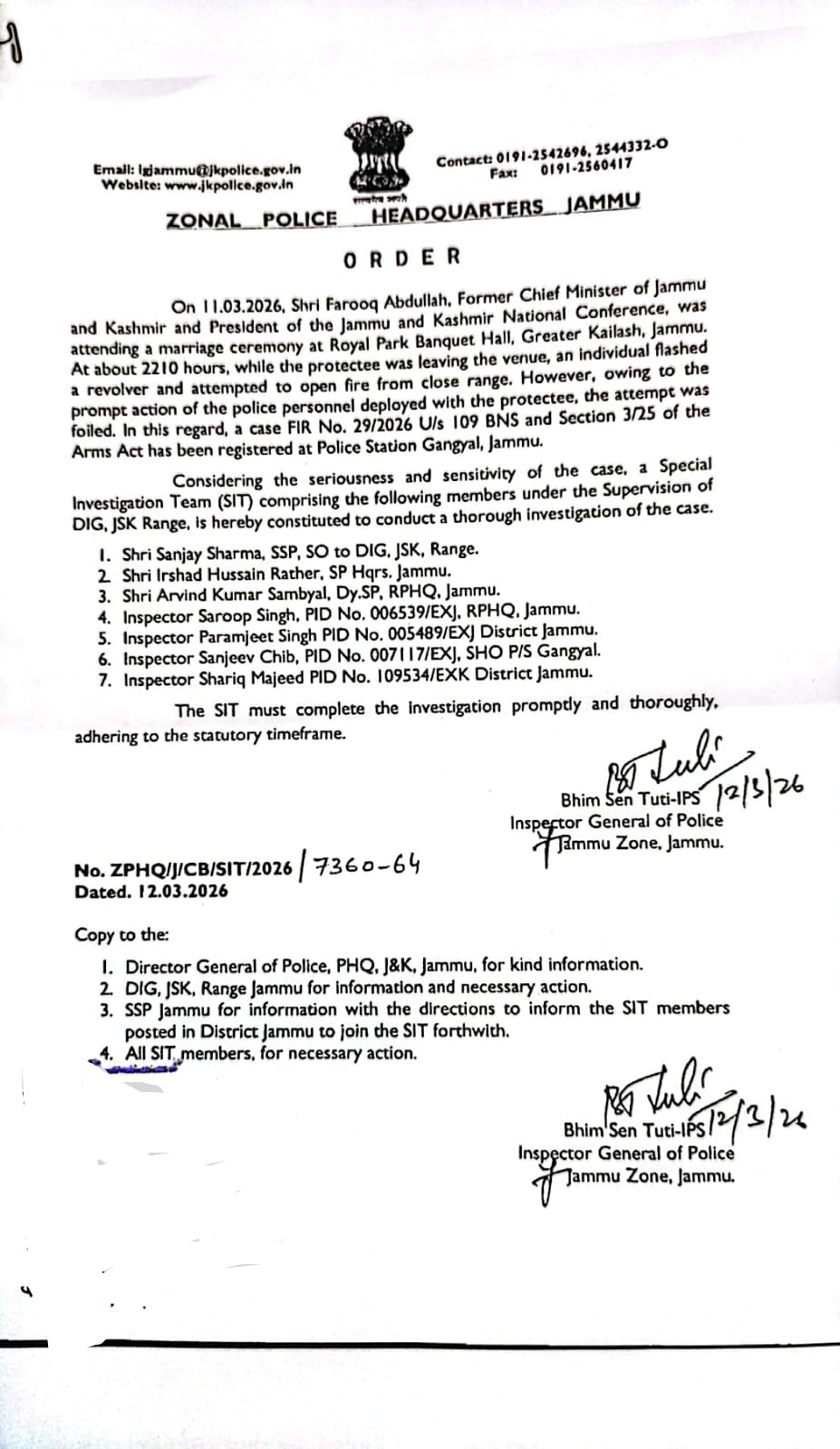 जम्मू-कश्मीर पुलिस ने नेशनल कॉन्फ्रेंस के अध्यक्ष फारूक अब्दुल्ला पर हुई गोलीबारी के मामले की जांच के लिए DIG की देखरेख में एक SIT का गठन किया है.