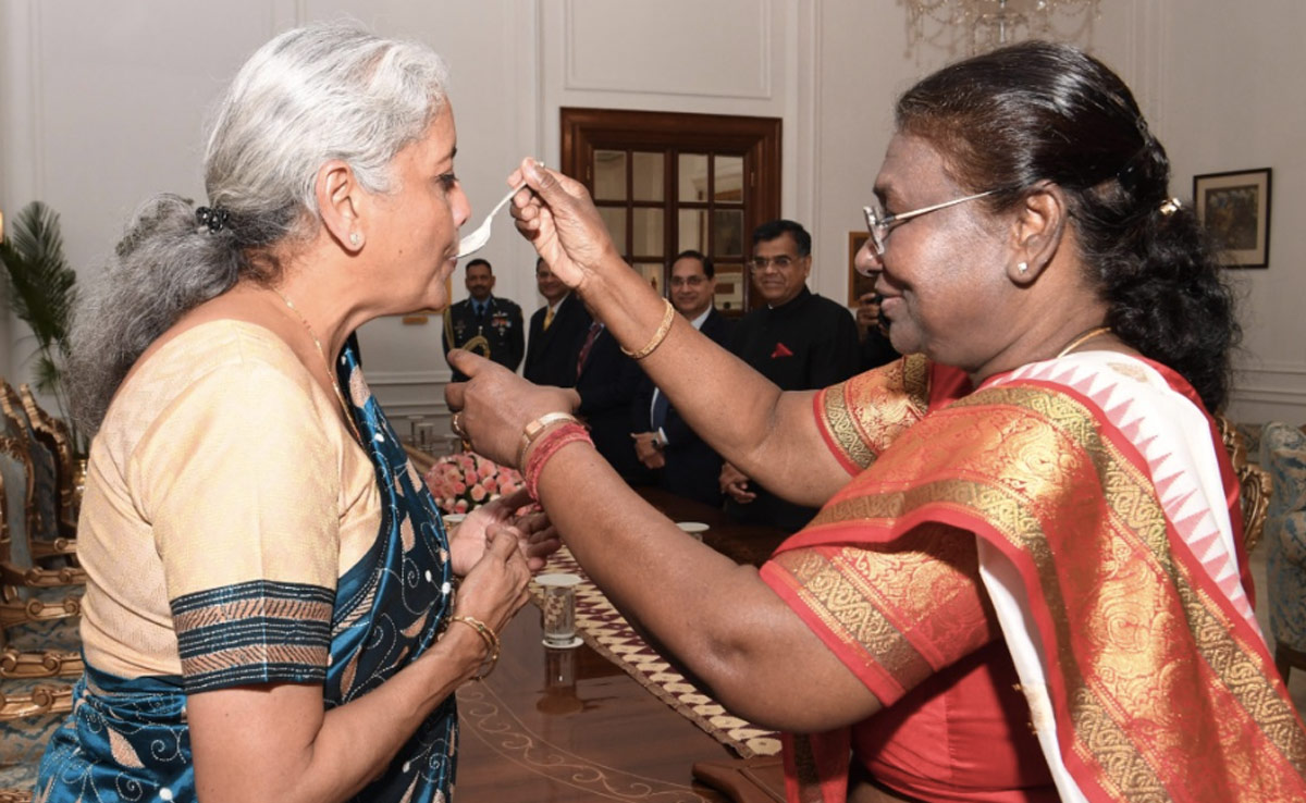 Budget 2024: वित्तमंत्री निर्मला सीतारमण (Nirmala Sitharaman) संसद पहुंचने से पहले राष्ट्रपति द्रौपदी मुर्मू से मिलने पहुंचीं. जब निर्मला सीतारमण राष्ट्रपति से मिलने पहुंचीं तो उन्होंने वित्तमंत्री को मीठा खिलाकर रवाना किया. इस प्रेम और सम्मान से भरे पल की तस्वीरें सामने आई हैं. इस मौके पर वह नीले रंगी की साड़ी पहने नजर आईं. इसके बाद निर्मला सीतारमण सीधे संसद भवन बजट पेश करने पहुंचीं.