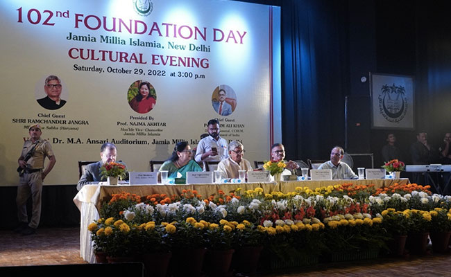 सभागार के अंदर जामिया तराना के गायन के साथ समारोह की शुरुआत हुई, जिसके बाद मुख्य अतिथि और अन्य गणमान्य व्यक्तियों का अभिनंदन किया गया. प्रो. फरहत नसरीन, इतिहास और संस्कृति विभाग, जामिया, सुश्री मिर्जा शाइना बेग और नवी हसन, विश्वविद्यालय के छात्रों ने शानदार इतिहास और जामिया की 102 साल की यात्रा पर अपने ओजपूर्ण भाषणों से दर्शकों को मंत्रमुग्ध कर दिया.