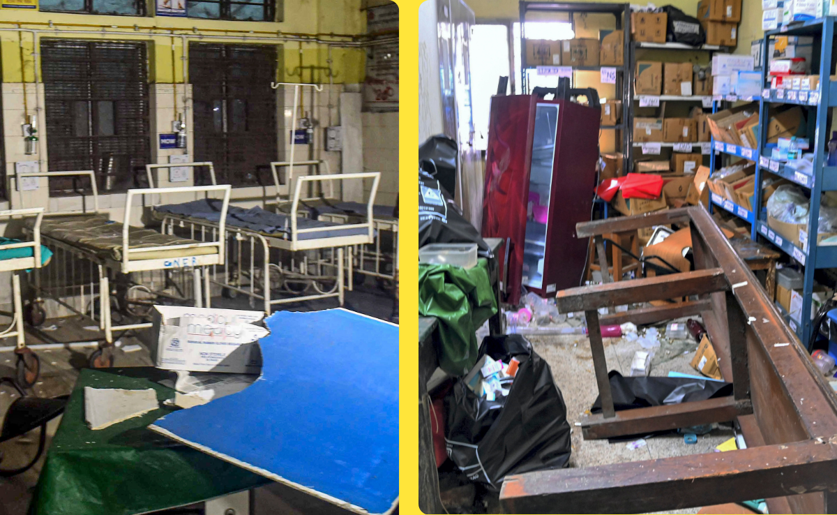 स्वास्थ्य विभाग के एक वरिष्ठ अधिकारी ने बताया कि बुधवार और बृहस्पतिवार की दरमियानी रात में आपात कक्ष, कर्मचारियों के कक्षों और औषधि भंडार में भारी तोड़फोड़ की गई थी. उन्होंने बताया कि लगभग सभी सीसीटीवी कैमरे भी तोड़ दिये गये थे. उन्होंने बताया कि उस सेमिनार हॉल के एक हिस्से में भी तोड़फोड़ की गई तथा दरवाजे क्षतिग्रस्त कर दिये गये, जहां एक महिला डॉक्टर के साथ कथित तौर पर बलात्कार किया गया था तथा उसकी हत्या कर दी गई थी.