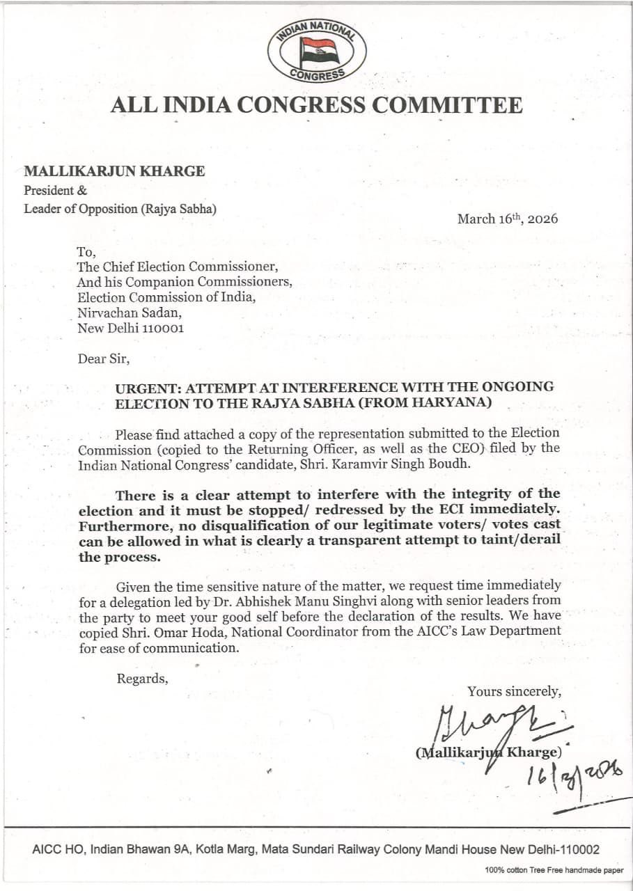 हरियाणा में वोट विवाद पर काउंटिंग रुकी, खरगे ने EC को लिखा लेटर