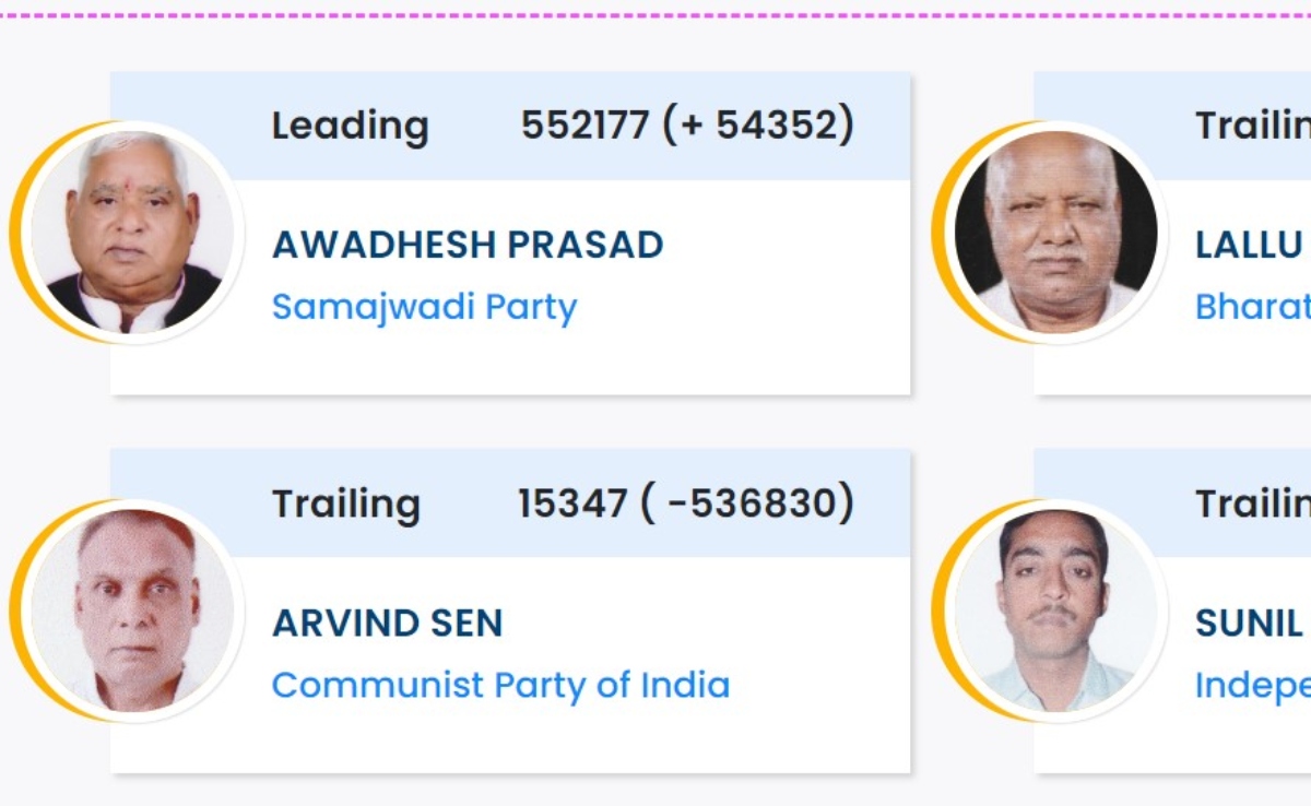 चुनाव आयोग के ताजा हिंदुत्व की राजधानी मानी जाने वाली सीट अयोध्या में बीजेपी हार की कगार पर है.राम मंदिर के निर्माण और कई विकास परियोजनाओं के बाद भी समाजवादी पार्टी के प्रत्याशी अवधेश प्रसाद बीजेपी प्रत्याशी लल्लू सिंह पर बढ़त बनाए हैं.