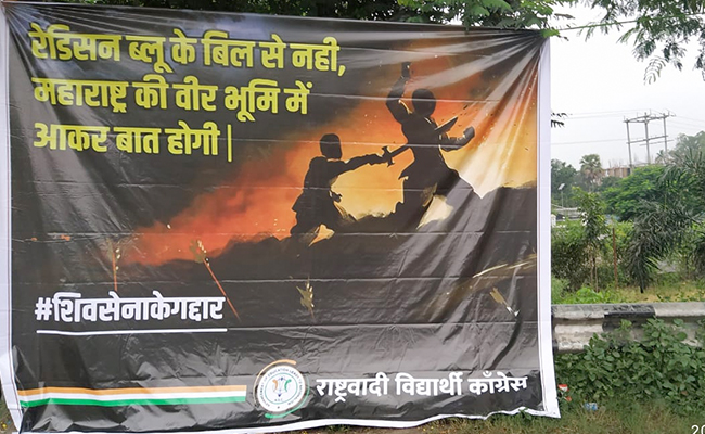 राष्ट्रवादी विद्यार्थी कांग्रेस की ओर से लगाए गए पोस्टर में शिवसेना के बागी विधायकों को निशाना बनाया गया है. साथ ही पोस्टर में लिखा गया है, ' रेडिशन ब्लू के बिल से नहीं, महाराष्ट्र की वीर भूमि में आकर बात होगी. शिव सेना के गद्दार. राष्ट्रवादी विद्यार्थी कांग्रेस.
