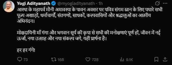 योगी आदित्यनाथ ने प्रदेशवासियों को मौनी अमावस्या की बधाई दी