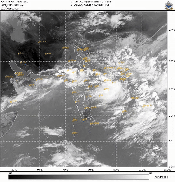 INSAT-3R सैटेलाइट इमेज दक्षिण जम्मू और कश्मीर, हिमाचल प्रदेश, पंजाब, हरियाणा, दक्षिण उत्तर प्रदेश, दक्षिण छत्तीसगढ़, दक्षिण तटीय ओडिशा, पूर्व तेलंगाना, उत्तर तटीय आंध्र प्रदेश, अंडमान और निकोबार द्वीप क्षेत्र में तेज से बहुत तेज और पूर्वी राजस्थान, पूर्व मध्य प्रदेश, उत्तर छत्तीसगढ़, रायलसीमा, दक्षिण आंतरिक कर्नाटक, केरल, तमिलनाडु, असम, मेघालय, लक्षद्वीप द्वीप क्षेत्र में मध्यम से तेज कंवेक्शन का संकेत देती है.