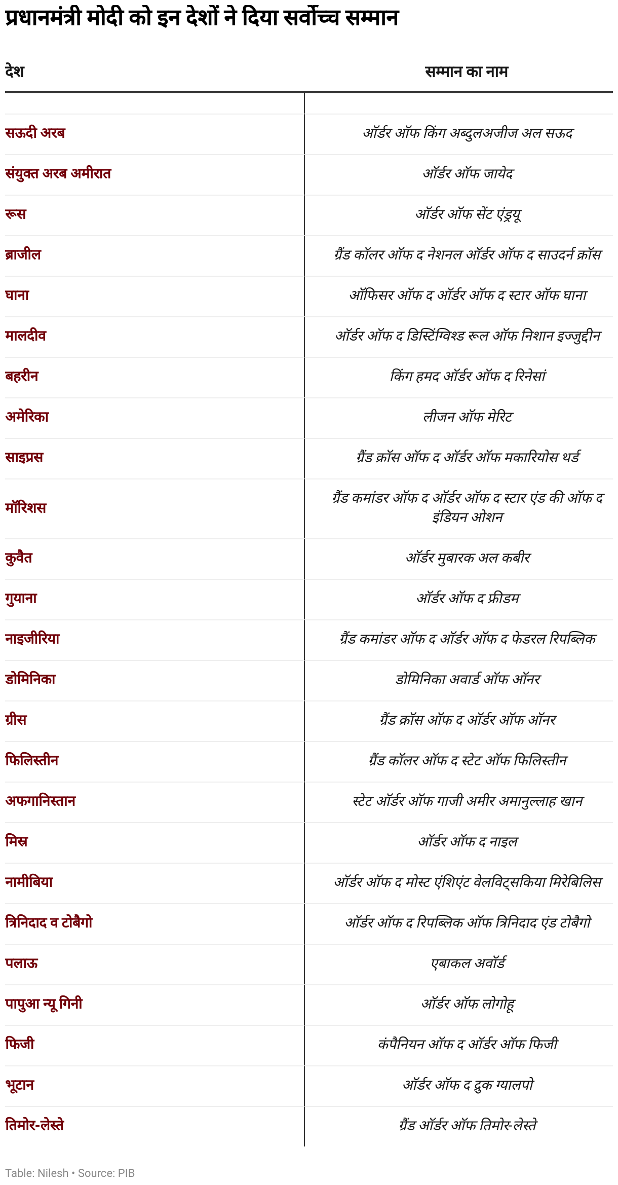 अब तक 26 देशों ने पीएम मोदी को अपने सर्वोच्च नागरिक सम्मान से नवाजा है. इनमें एशिया, यूरोप, अफ्रीका, खाड़ी देश, ओशिनिया और अमेरिका के देश शामिल हैं. 2016 से लेकर अब तक मोदी को हर साल किसी न किसी देश से यह सम्मान मिलता रहा है. प्रधानमंत्री मोदी खुद को 'प्रधान सेवक' कहकर देश की 140 करोड़ जनता की आकांक्षाओं और विकास के सपनों को अंतरराष्ट्रीय मंचों तक ले जाते रहे हैं.