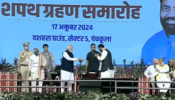 हरियाणा (Haryana) में लगातार तीसरी बार भारतीय जनता पार्टी की सरकार बन गयी है. नायब सिंह सैनी ने गुरुवार को मुख्यमंत्री पद की शपथ ली. समारोह में पीएम मोदी, केंद्रीय मंत्री अमित शाह और राजनाथ सिंह समेत 20 राज्यों के मुख्यमंत्री मौजूद थे. शपथ ग्रहण समारोह पंचकूला के सेक्टर 5 स्थित परेड ग्राउंड में आयोजित किया गया था. सीएम पद की शपथ लेने के बाद नायब सिंह सैनी ने पीएम मोदी का आर्शिवाद लिया.