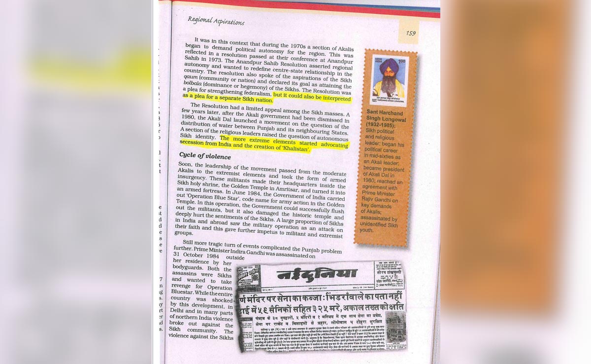 NCERT ने खालिस्तान और सिखों के लिए अलग राष्ट की मांग जैसे भागों को किताब से हटाए जाने को लेकर एक बयान भी जारी किया. NCERT ने कहा कि उप-शीर्षक 'पंजाब' के तहत तीसरे पैराग्राफ के अंतिम वाक्य से लाइन '... लेकिन इसे एक अलग सिख राष्ट्र के लिए एक दलील के रूप में भी समझा जा सकता है' को हटा दिया गया है. इस पंक्ति के ठीक पहले, दिए गए बयान को 'भारत में संघवाद को मजबूत करने के लिए संकल्प एक दलील थी' के रूप में फिर से लिखा गया है. उसी खंड (उप-शीर्षक 'पंजाब') में, चौथे पैराग्राफ के अंतिम वाक्य से, '... और खालिस्तान का निर्माण' हटा दिया गया है.