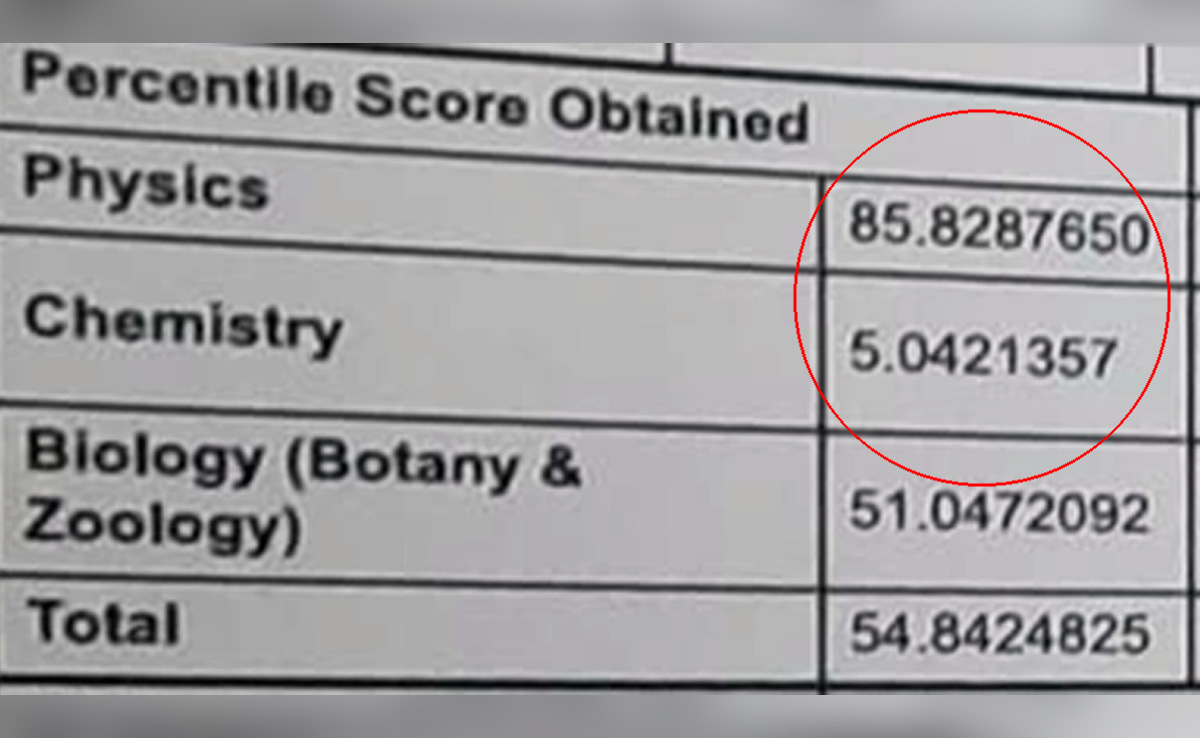नेशनल टेस्टिंग एजेंसी द्वारा जारी अनुराग के स्कोरकार्ड से पता चलता है कि उसने 720 में से 185 अंक हासिल किए हैं. उसका कुल पर्सेंटाइल स्कोर 54.84 (राउंड ऑफ) है. लेकिन अलग-अलग विषयों में उसके अंकों पर नजर डालने से संख्याओं का एक विचित्र बेमेल पता चलता है. अनुराग ने फिजिक्स में 85.8 परसेंटाइल और बायोलॉजी में 51 परसेंटाइल स्कोर हासिल किया. लेकिन उसकी केमिस्ट्री 5 पर्सेंटाइल अंक ही मिले हैं. छात्र ने स्वीकार किया कि उसे परीक्षा से एक दिन पहले प्रश्न मिल गए थे, इन अंकों से पता चलता है कि उसे के केमिस्ट्री उत्तर याद करने के लिए पर्याप्त समय नहीं मिला था. अनुराग का ऑल इंडिया रैंक 10,51,525 बताई गई है और ओबीसी उम्मीदवार के रूप में उसकी रैंक 4,67,824 है.