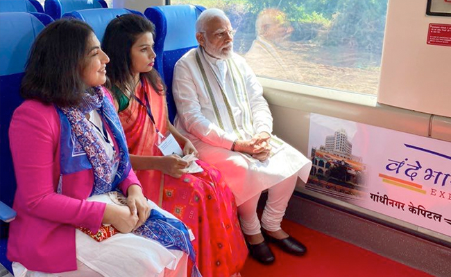 पीएम ने वह वंदे भारत ट्रेन में को चलाने वाली महिलाओं और महिला शोधकर्ताओं से भी बातचीत की.पीएम मोदी ने आज सुबह न केवल गांधीनगर कैपिटल रेलवे स्टेशन से ‘वंदे भारत एक्सप्रेस' को हरी झंडी दिखाई, बल्कि वंदे भारत एक्सप्रेस ट्रेन पर गांधीनगर से अहमदाबाद के बीच सफर भी किया. पीएमओ ने कहा कि पीएम मोदी के संग इस सफर में रेलवे परिवार, महिला उद्यमी, युवा और अलग-अलग क्षेत्रों के लोग सहयात्री बने.