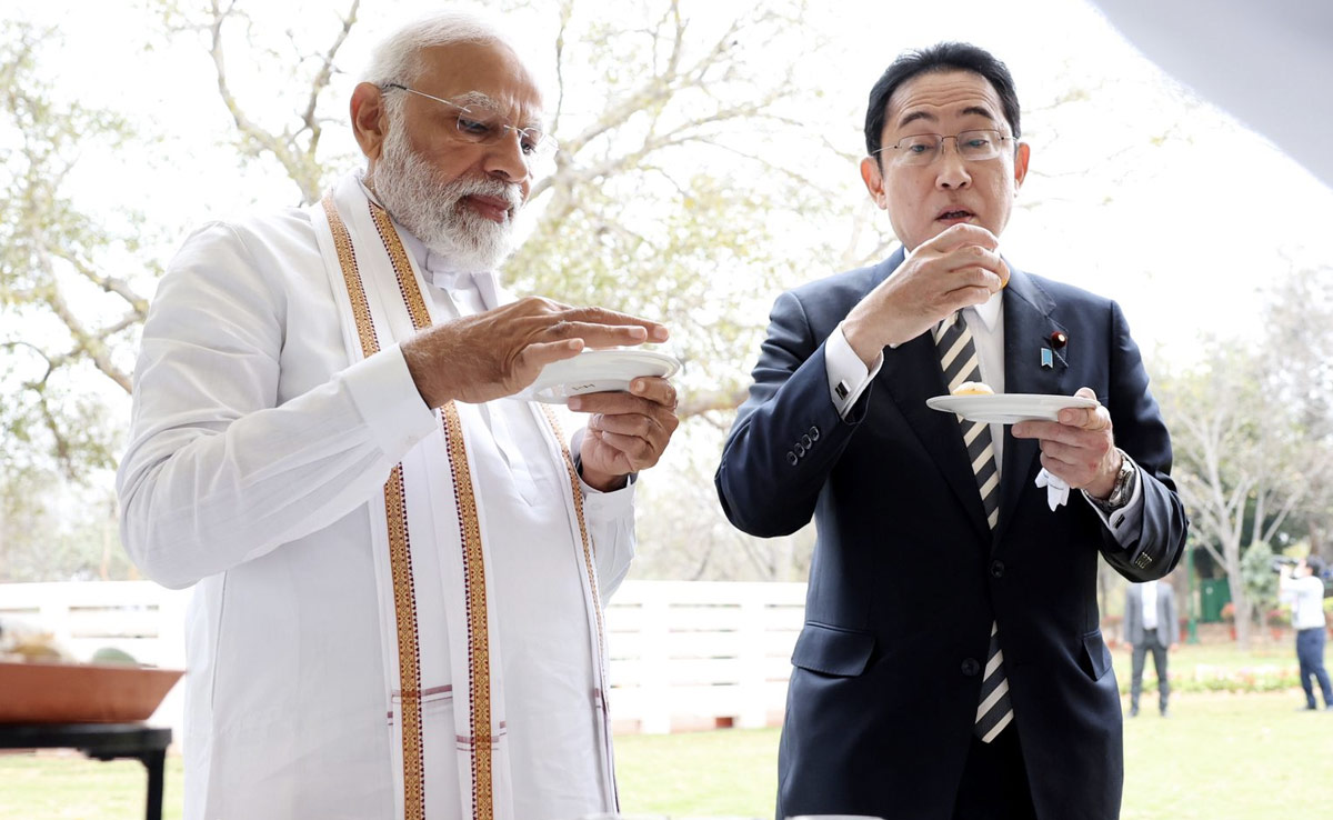 जापान के प्रधानमंत्री फुमियो किशिदा (Fumio Kishida)भारत दौरे पर हैं. सोमवार को उन्होंने नई दिल्ली स्थित हैदराबाद हाउस में प्रधानमंत्री नरेंद्र मोदी (PM Narendra Modi)से मुलाकात की. इस दौरान दोनों देशों के नेताओं के बीच कई अहम मुद्दों पर बातचीत हुई. इस बीच पीएम मोदी और जापानी प्रधानमंत्री फुमियो किशिदा के साथ दिल्ली के बुद्ध पार्क में सैर करने गए. पीएम मोदी ने इस दौरान फुमियो किशिदा को पारंपरिक खाने का स्वाद चखाया. पीएम मोदी ने जापानी पीएम को गोलगप्पे खिलाए. इसके बाद दोनों ने लस्सी का मजा भी लिया.