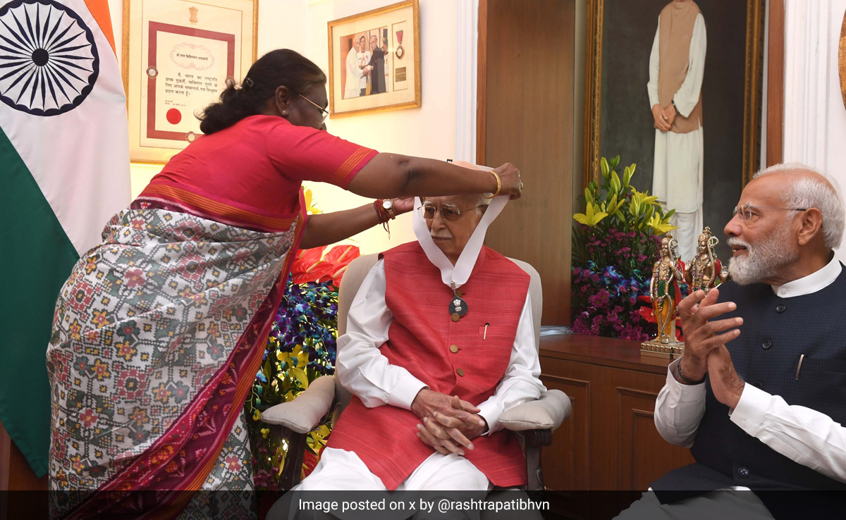 राष्ट्रपति द्रौपदी मुर्मू ने रविवार को भारतीय जनता पार्टी (भाजपा) के दिग्गज नेता एवं पूर्व प्रधानमंत्री लाल कृष्ण आडवाणी को यहां उनके आवास पर देश का सर्वोच्च नागरिक सम्मान 'भारत रत्न' प्रदान किया. राष्ट्रपति भवन ने 'एक्स' पर एक पोस्ट में कहा कि इस समारोह में उपराष्ट्रपति जगदीप धनखड़, प्रधानमंत्री नरेन्द्र मोदी, रक्षा मंत्री राजनाथ सिंह, गृहमंत्री अमित शाह और आडवाणी के परिवार के सदस्य मौजूद रहे.