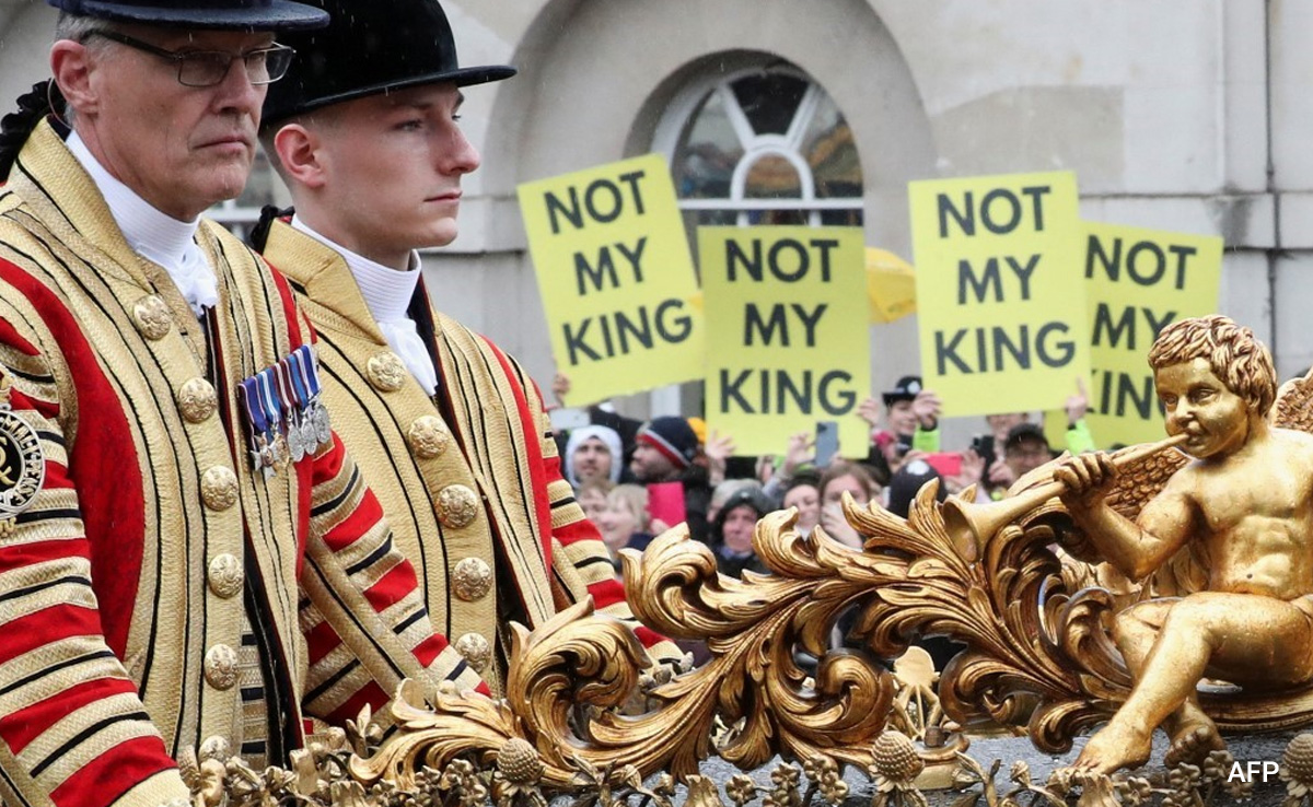 ब्रिटेन में किंग चार्ल्स तृतीय (King Charles III) के राज्याभिषेक के दौरान शनिवार को राजशाही विरोधी लोगों ने विरोध प्रदर्शन (Protest) किया. विरोध कर रहे लोगों ने "नॉट माइ किंग" (Not My King) के नारे लगाए. इस पर अधिकारियों ने उन्हें शांत रहने और वापस जाने के लिए कहा, लेकिन बात नहीं मानने पर प्रदर्शनकारियों को गिरफ्तार कर लिया गया. उत्तरी शहर लीड्स में एक 21 वर्षीय छात्र ने "नो मोर रॉयल्स" शब्दों वाले 50 बीच बॉल का नारा लगाया. रिपब्लिक, ब्रिटेन के राजशाही विरोधी आंदोलन का प्रतिनिधित्व करने वाले एक समूह ने पीले रंग की टी-शर्ट पहनी हुई थी और सुबह तक "नॉट माई किंग" के नारे लगाता रहा.