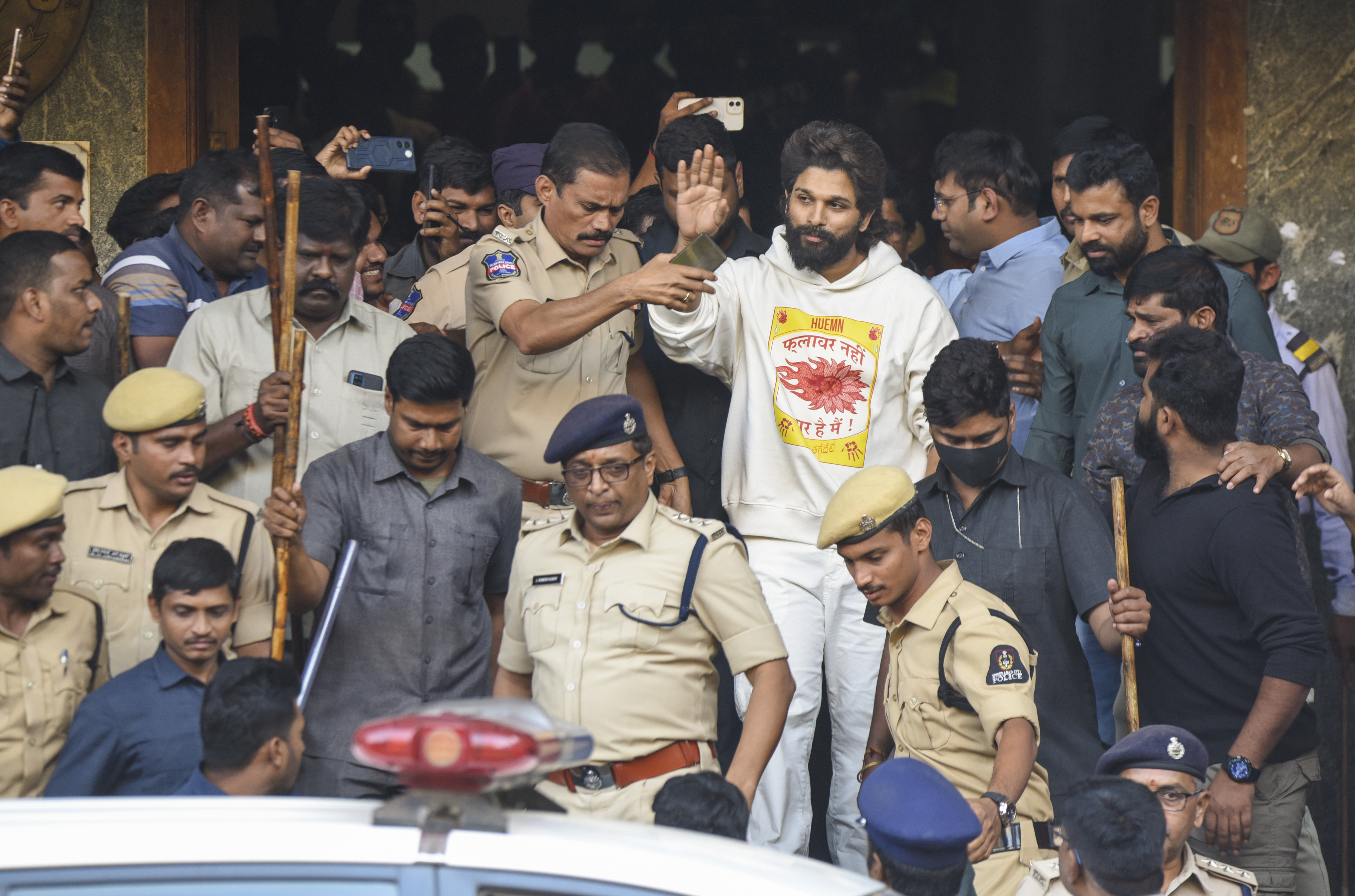 गिरफ्तारी के समय अल्लू अर्जुन ने अपनी फिल्म पुष्पा के फेमस डायलॉग 'फ्लावर नहीं फायर है मैं' लिखी व्हाइट कलर की हुडी पहन रखी थी. सोशल मीडिया पर अल्लू अर्जुन की दो तस्वीरें वायरल हो रही हैं. एक में वह लिफ्ट में हैं, तब उन्होंने शॉर्ट-टीशर्ट पहन रखी है. लेकिन पुलिस की वैन में बैठते समय उन्होंने हुडी पहनी हुई है.