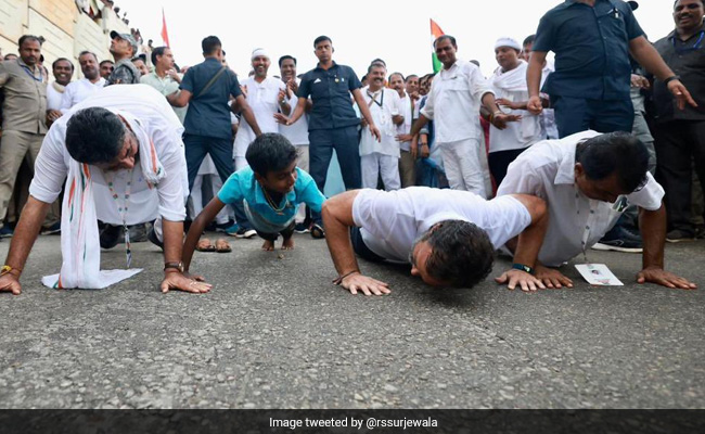 कांग्रेस नेता रणदीप सिंह सुरजेवाला ने ये फोटो शेयर की है. इसमें राहुल गांधी, कर्नाटक कांग्रेस यूनिट के प्रमुख डीके शिवकुमार, पार्टी महासचिव केसी वेणुगोपाल और एक बच्चे के साथ सड़क पर पुश-अप करते दिख रहे हैं. हालांकि, सिर्फ राहुल गांधी ही सही ढंग से पुश-अप्स कर पाते हैं. सुरजेवाला ने तस्वीर को कैप्शन दिया-