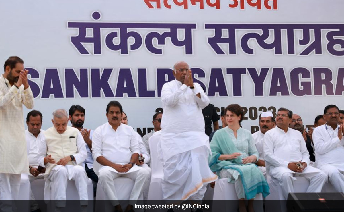 - कांग्रेस अध्यक्ष मल्लिकार्जुन खरगे, पार्टी महासचिव प्रियंका गांधी वाड्रा और कांग्रेस के कई अन्य नेता भी इस 'संकल्प सत्याग्रह' में शामिल हुए हैं.