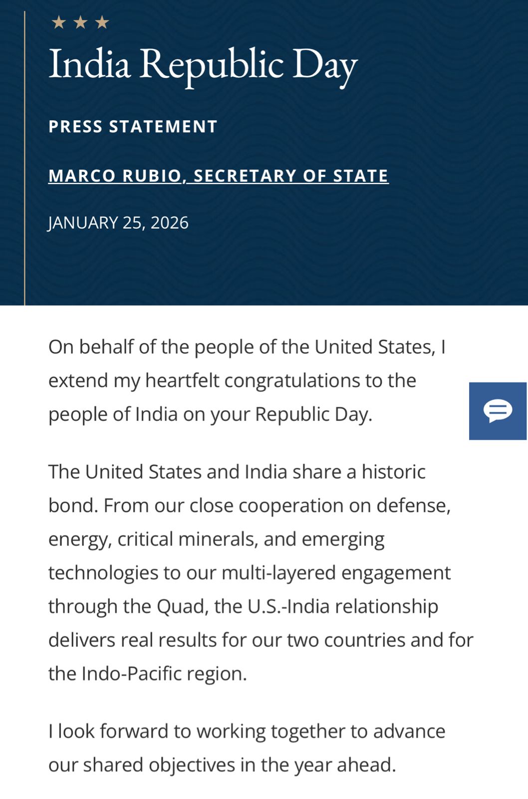 Republic Day 2026: अमेरिकी विदेश मंत्री ने भारतीयों को दी गणतंत्र दिवस की बधाई