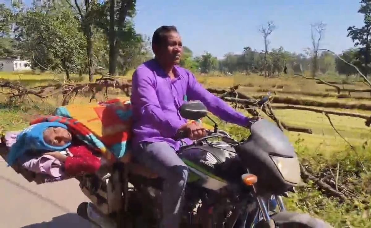 अपनी पत्नी कपुरा मरकाम को इलाज के लिए बाइक पर बने अस्थायी एंबुलेंस में लेकर जाते समलू मरकाम.