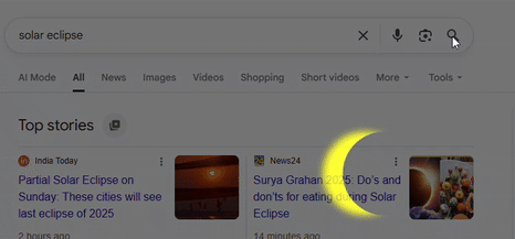 हालांकि ये पहली बार नहीं है जब गूगल ने ऐस कुछ किया हो, तमाम बड़े दिनों या इवेंट्स पर गूगल ऐसा ही इफेक्ट डालता है. जैसे वैलेंटाइन डे के मौके पर स्क्रीन रेड हार्ट से भर जाती है, वहीं होली के मौके पर फूलों की बारिश नजर आती है. अब सूर्य ग्रहण के मौके पर भी गूगल ने कुछ ऐसा ही इफेक्ट डाला है.