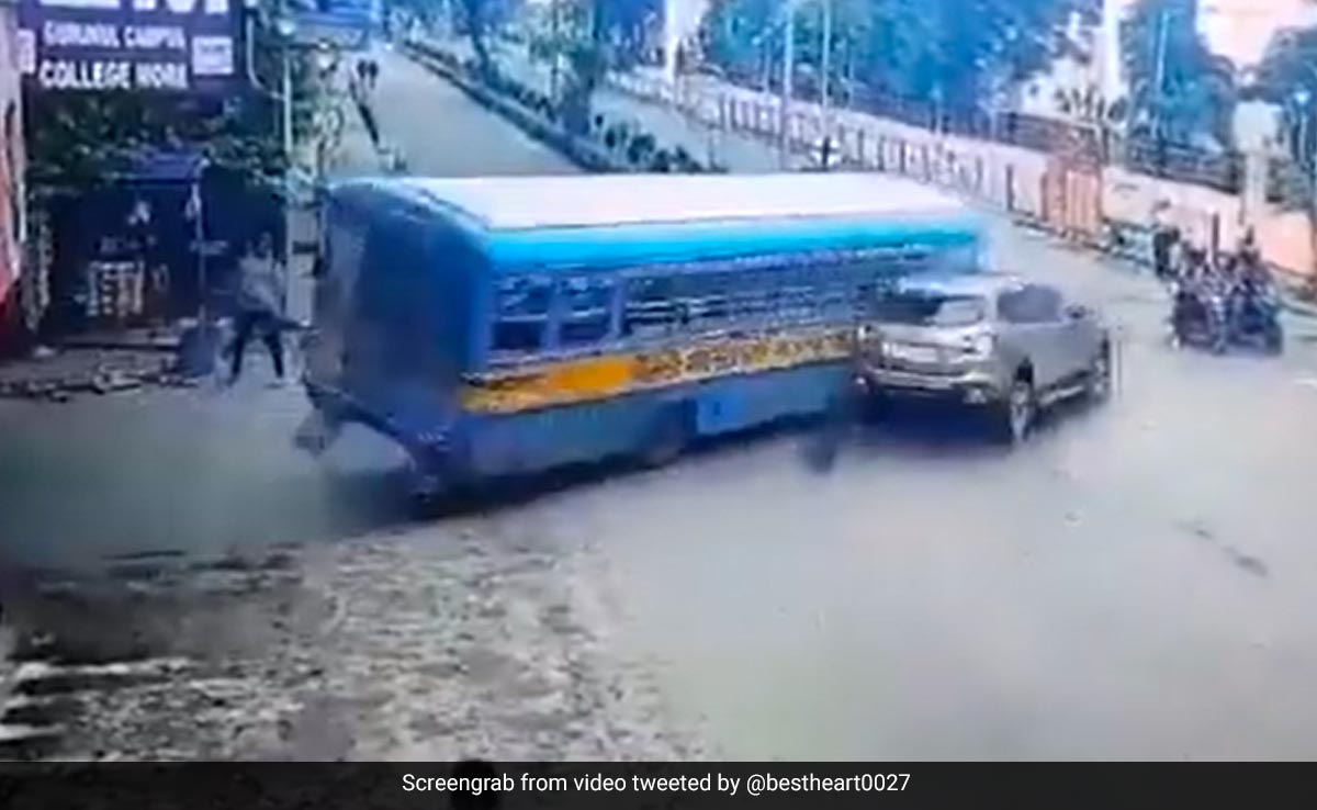 कोलकाता से एक भीषण दुर्घटना का वीडियो सामने आया है जहां एक निजी बस सड़क के दूसरी ओर से आ रही एसयूवी से टकरा गई. स्थानीय आउटलेट्स के अनुसार, दुर्घटना सोमवार (2 अक्टूबर) को कॉलेज जंक्शन पर हुई, जो साल्ट लेक सेक्टर 5 के सबसे व्यस्त केंद्रों में से एक है. टेलीग्राफ ने कहा कि तेज रफ्तार बस ने लाल बत्ती तोड़ दी और कार से टकराने के बाद पलट गई. यह घटना ट्रैफिक जंक्शन पर लगे सीसीटीवी में कैद हो गई और यह क्लिप सोशल मीडिया पर वायरल हो गई है.