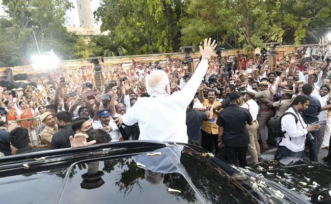 प्रधानमंत्री ने भी कार के अंदर से हाथ हिलाकर कार्यकर्ताओं का अभिवादन स्वीकार किया.कुछ कार्यकर्ताओं और समर्थकों ने 'थलाइवा' का नारा लगाया, जिसका मोटे तौर पर अर्थ होता है 'नेता'. एक स्थान पर मोदी ने एक मिनट के लिए अपनी कार रोकी और गाड़ी के रनिंग बोर्ड पर खड़े होकर पार्टी कार्यकर्ताओं का अभिवादन किया.