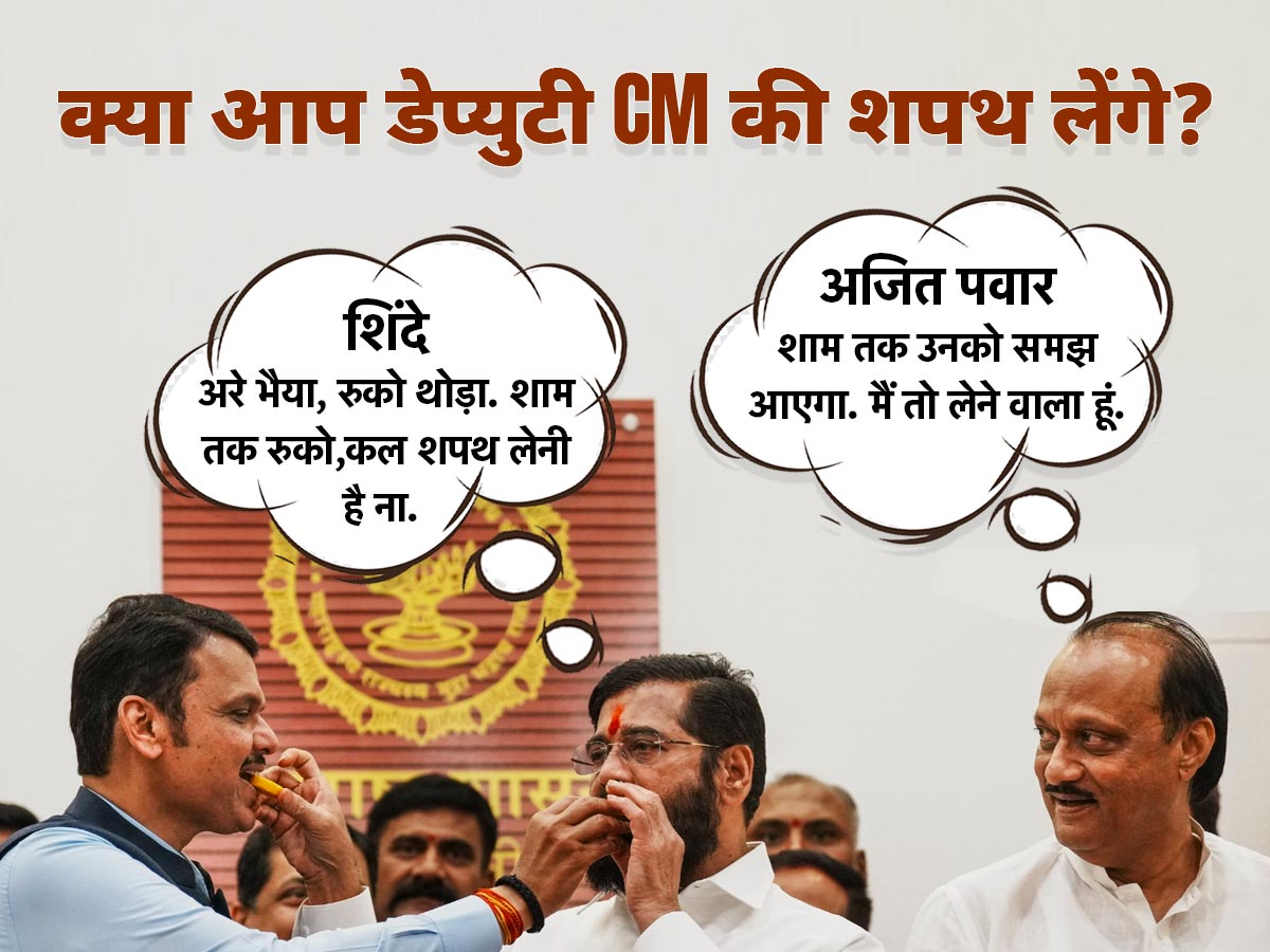 महाराष्ट्र में गुरुवार को मुख्यमंत्री की कुर्सी संभालने जा रहे देवेंद्र फडणवीस के साथ क्या एकनाथ शिंदे और अजित पवार भी उप-मुख्यमंत्री पद की शपथ लेंगे? इस समय यह लाख टके का सवाल है. बुधवार को शिंदे और पवार से जब यह सवाल पूछा गया, तो जवाब में दोनों जो बोला, उस पर ठहाके लग गए. इन ठहाकों में शिंदे ने ऐसा सस्पेंस छोड़ दिया, जिस पर अब उनकी 'हां' और 'ना' न आने तक अटकलें लगती रहेंगी. दरअसल शिंदे ने डेप्युटी सीएम की शपथ पर पत्रकार को जवाब देते हुआ कहा कि शाम तक इंतजार करें, उनका जवाब आ जाएगा. शिंदे ने इतना ही बोला था कि पास बैठे अजित पवार ने भी चुटकी लेते हुए बोल दिया- इनको तो शाम तक समझ आएगा, लेकिन मैं तो लेने जा रहा हूं. इस पर अब फिर अकटलें तेज हो गई हैं क्या शिंदे फडणवीस के साथ अपनी कुर्सी बदलेंगे.