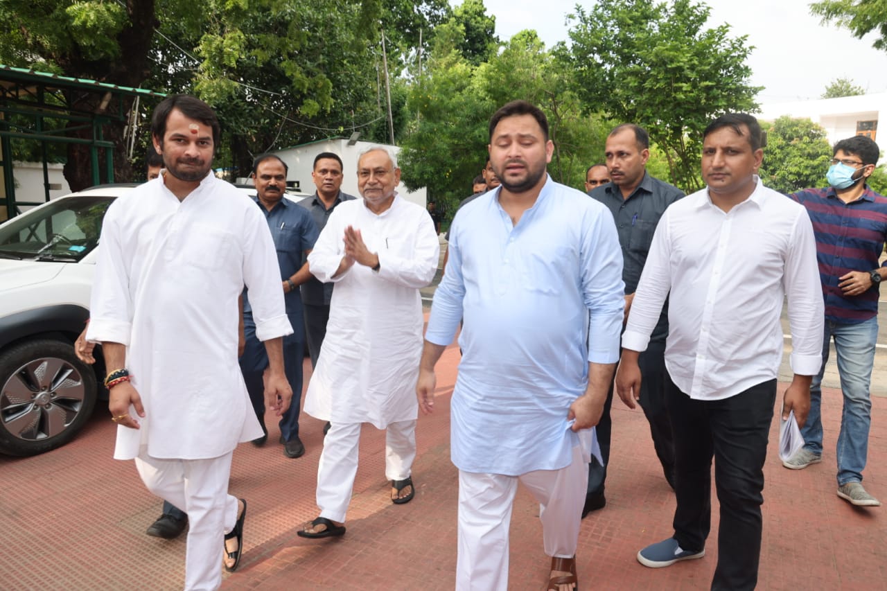 बिहार के मुख्यमंत्री नीतीश कुमार (Nitish Kumar) ने मंगलवार शाम को मुख्यमंत्री पद से इस्तीफा देने दोबारा आरजेडी समेत सात दलों के महागठबंधन के साथ मिलकर दोबारा सरकार बनाने का दावा पेश किया. वो शाम 4 बजे के करीब आरजेडी नेता तेजस्वी यादव (Tejashwi Yadav) , जेडीयू अध्यक्ष ललन सिंह, हम के जीतनराम मांझी और कांग्रेस नेताओं के साथ राजभवन गए और नई सरकार बनाने का दावा पेश किया. हालांकि राज्यपाल फागू चौहान ने अभी नई सरकार के शपथ के लिए तारीख नहीं दी है. इससे पहले मंगलवार दोपहर को राजभवन जा कर मुख्यमंत्री पद से त्यागपत्र दे दिया. उन्होंने सुबह जेडीयू विधायक दल की बैठक में बीजेपी से गठबंधन तोड़ने का ऐलान करने के बाद यह कदम उठाया. इसके बाद नीतीश कुमार आरजेडी नेता तेजस्वी यादव के घर पहुंचे. जहां सभी दलों की एक बैठक हुई और अब एक बार फिर नीतीस कुमार राजभवन जा रहे हैं. उनके साथ तेजस्वी यादव और कांग्रेस नेता अजीत शर्मा तथा पूर्व मुख्यमंत्री जीतन राम मांझी भी हैं.