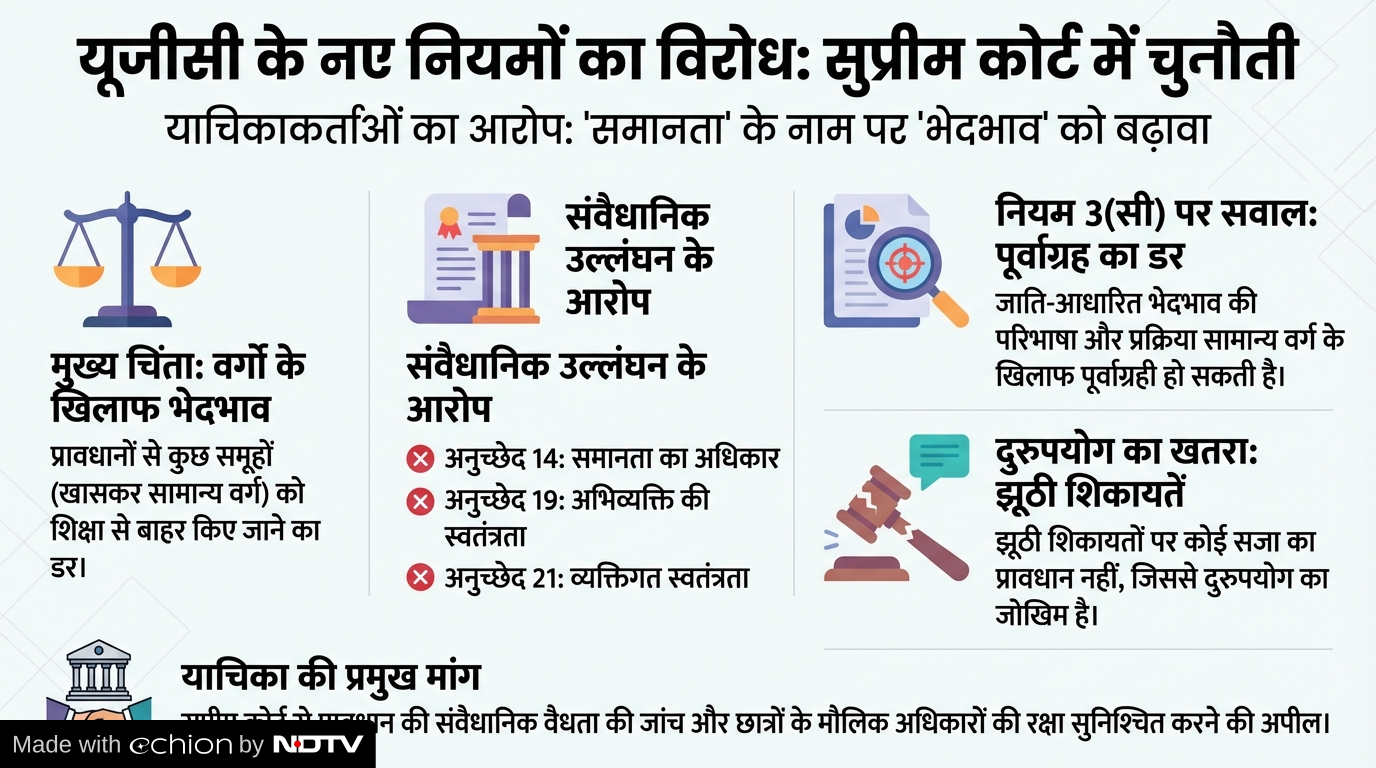 - -हालांकि, याचिकाकर्ता का कहना है कि नियम 3(सी) में जाति-आधारित भेदभाव की परिभाषा और प्रक्रिया ऐसी है कि यह सामान्य वर्ग के छात्रों/शिक्षकों के खिलाफ पूर्वाग्रही हो सकती है. इसमें झूठी शिकायतों पर कोई सजा का प्रावधान नहीं है, जिससे दुरुपयोग का खतरा है. याचिका में मांग की गई है कि सुप्रीम कोर्ट इस प्रावधान की संवैधानिक वैधता की जांच करे और छात्रों के मौलिक अधिकारों की रक्षा सुनिश्चित करे.