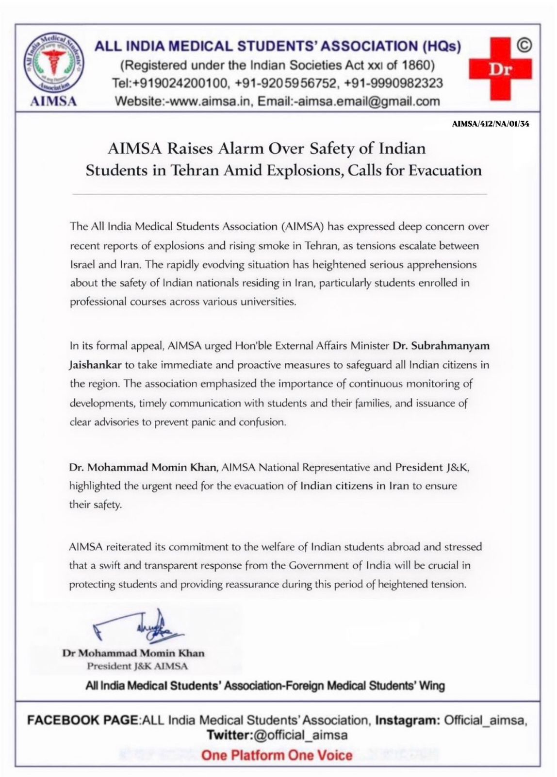 ऑल इंडियन मेडिकल स्टूडेंट्स’ एसोसिएशन ने विदेश मंत्री डॉ. एस. जयशंकर को पत्र लिखकर तेहरान में हुए धमाकों के बीच वहां मौजूद भारतीय छात्रों की सुरक्षा पर चिंता जताई है और तुरंत निकासी की मांग की है.अपील में, AIMSA ने विदेश मंत्री डॉ. सुब्रह्मण्यन जयशंकर से आग्रह किया गया कि वे तुरंत और सक्रिय कदम उठाएं, ताकि उस क्षेत्र में मौजूद सभी भारतीय नागरिक सुरक्षित रहें. संगठन ने कहा कि हालात पर लगातार नजर रखना, छात्रों और उनके परिवारों से समय‑समय पर संपर्क बनाए रखना, और साफ‑साफ सलाह जारी करना बहुत जरूरी है ताकि घबराहट और भ्रम न फैले.