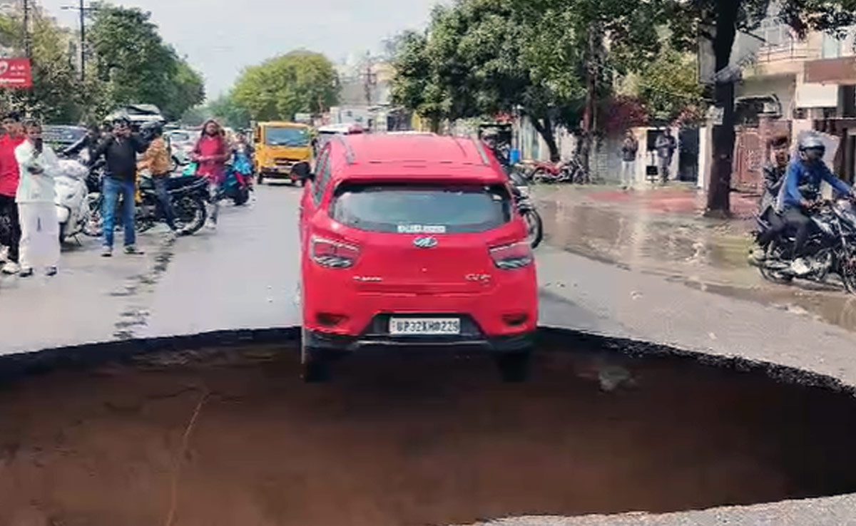 वीडियो में नजर आ रहा है कि कार गड्ढे के ऊपर इस तरह से है कि उसके दो टायर हवा में हैं तो दो सड़क पर हैं. ऐसा लग रहा है कि वो कभी भी गड्ढे में समा सकती है. हालांकि गनीमत रही कि कार गड्ढे में समाने से बच गई और एक हादसा टल गया.