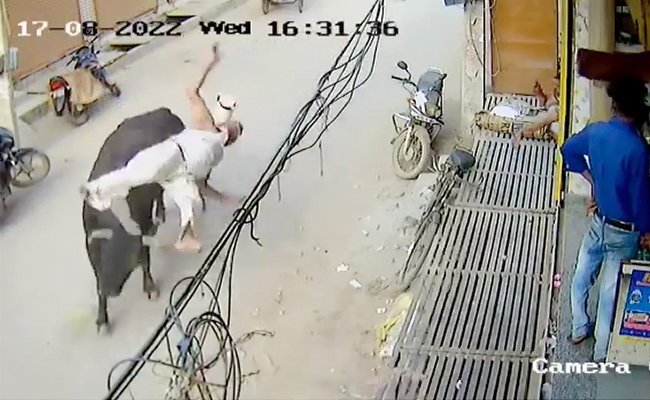 सीसीटीवी फुटेज में दिख रहा है कि बुजुर्ग सड़क पार कर रहे हैं, इसी दौरान सांड पीछे से उन पर हमला कर देता है. बुजुर्ग को अपनी सींग से हवा में उछालकर फिर जमीन पर पटक देता है. इसके बाद आसपास के लोग उसकी मदद के लिए दौड़ पड़ते हैं और उन्हें उठाकर अस्पताल पहुंचाया जाता है.
