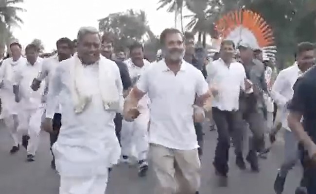 कांग्रेस की भारत जोड़ो यात्रा का एक वायरल वीडियो सामने आया है, जिसमें पार्टी के पूर्व अध्यक्ष राहुल गांधी को कर्नाटक के पूर्व मुख्यमंत्री सिद्धारमैया का हाथ पकड़कर उन्हें अपने साथ दौड़ाते हुए देखा जा सकता है. वीडियो में पूर्व मुख्यमंत्री को शुरू में मार्च के दौरान राहुल गांधी के ठीक बगल में चलते हुए देखा जा सकता है. वे अन्य कांग्रेस नेताओं और सुरक्षाकर्मियों के साथ थे. फिर अचानक सभी को आश्चर्यचकित करते हुए राहुल गांधी ने सिद्धारमैया का बायां हाथ पकड़ लिया और दौड़ना शुरू कर दिया. कांग्रेस के वरिष्ठ नेता को भी राहुल गांधी के रुकने तक उनके साथ तालमेल बिठाते हुए देखा जा सकता है.
